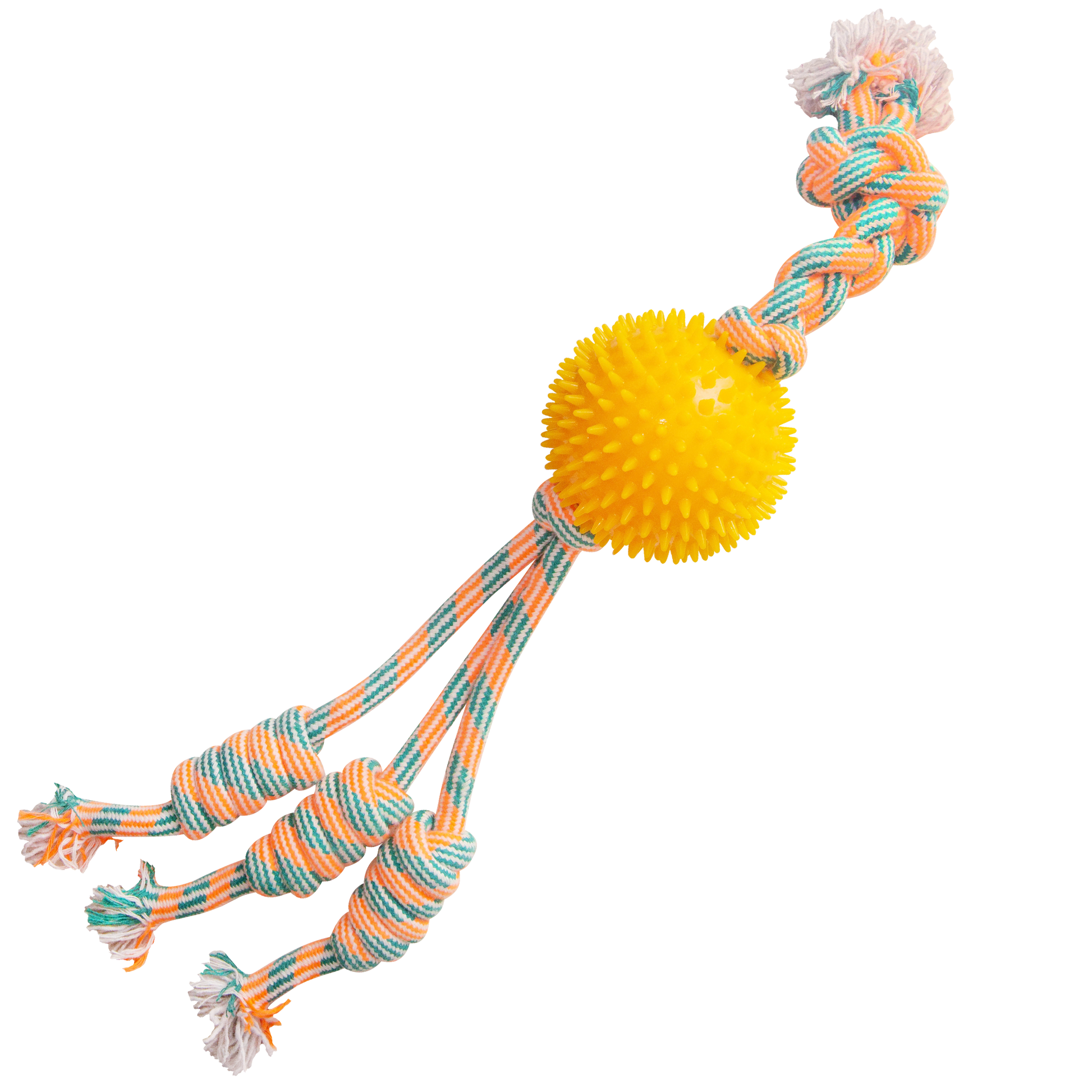 • Unique Design: Features three knotted strands leading into a central, larger Thermoplastic Rubber (TPR) ball, offering a variety of textures for your dog to explore.