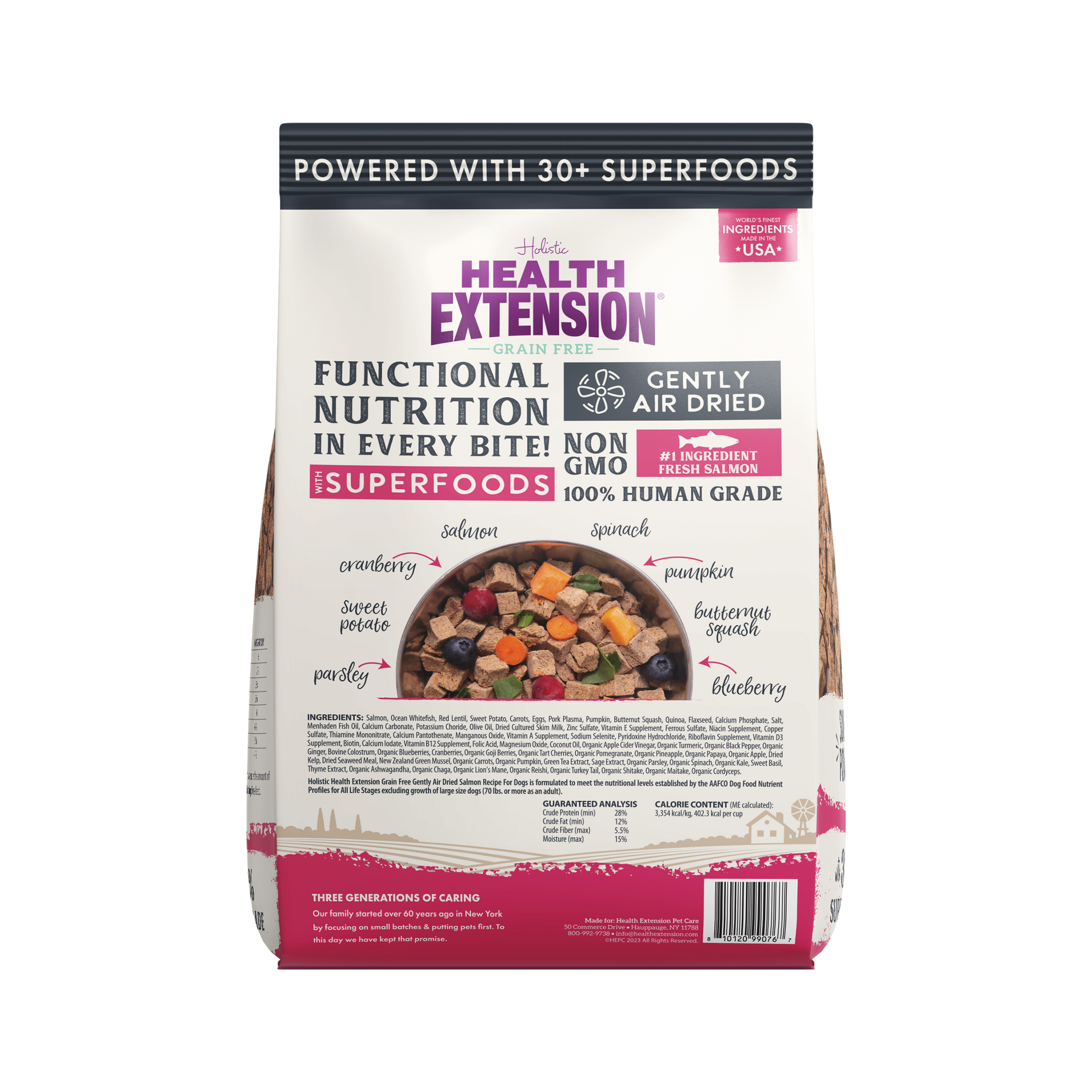Health Extension Gently Air Dried dog food is a convenient and cost effective alternative to homemade, frozen, and freeze-dried raw foods. These small-batch, complete and balanced recipes contain up to 85% protein from animal sources and powered with 30+ superfoods to boost immunity, including organic apple cider vinegar, turmeric, colostrum, lion’s mane mushroom, goji berry and coconut oil. Gently Air Dried is made with fresh human-grade ingredients starting with chicken, beef, or salmon and nutrient-packed vegetables such as pumpkin, carrots, and sweet potatoes. For all life stages.