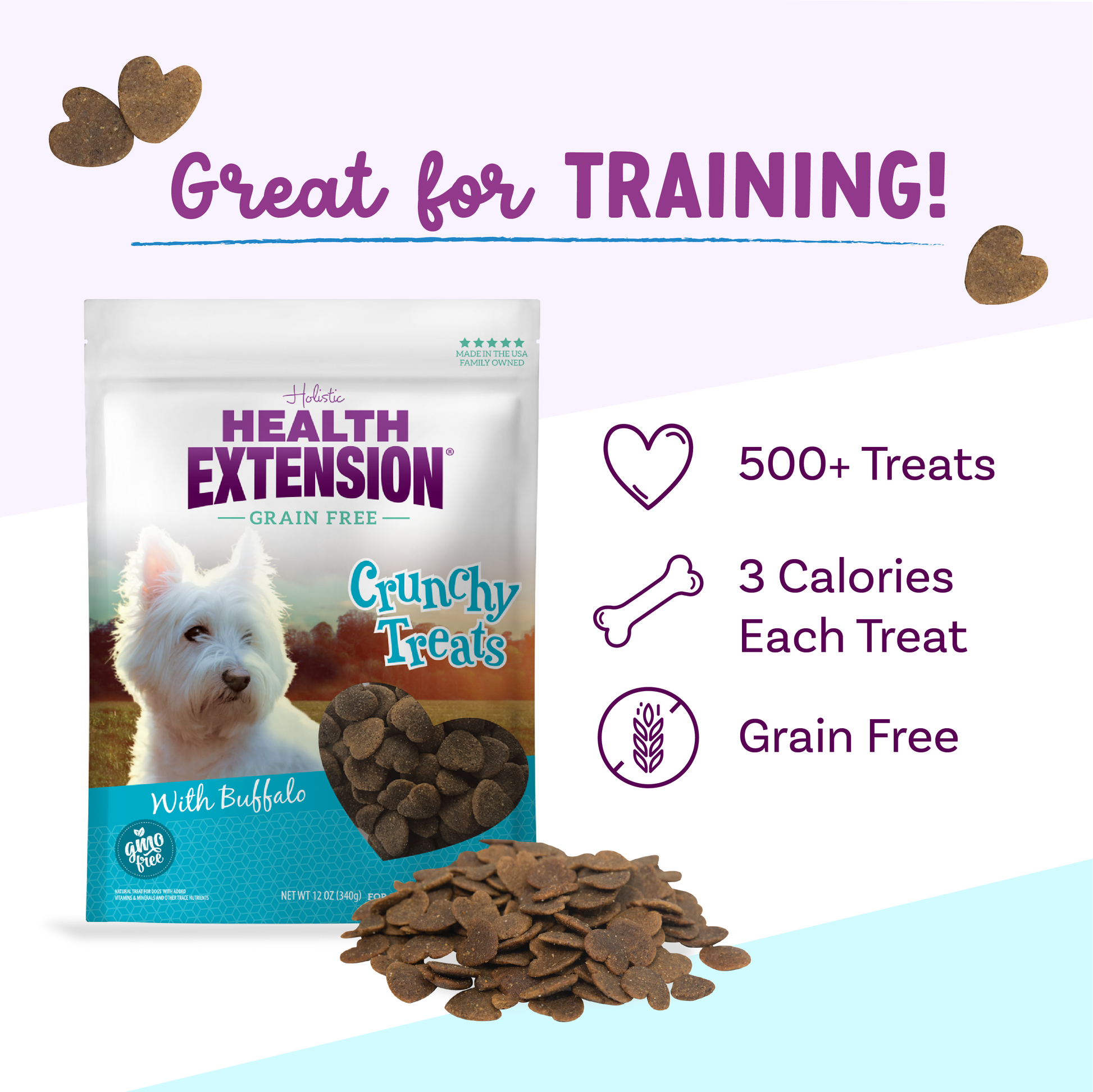 Indulge your beloved pup with our Grain Free Crunchy Heart Treats, a delicious blend of taste and texture that they will absolutely adore! Each heart-shaped treat is lovingly crafted with free-range buffalo and succulent deboned whitefish, enhanced with innovative ingredients such as anti-inflammatory turmeric, holistic apple cider vinegar, and nourishing pure coconut oil. These delightful treats come in a fun heart shape, symbolizing the love and care you have for your puppy or dog. Available in a convenient 12oz bag and in two sizes – small for dogs up to 20lbs and large for dogs over 20lbs – they're perfect for pets of all sizes. Proudly made in the USA, these treats are not just a snack, but a heartwarming gesture of affection for your canine companion.
