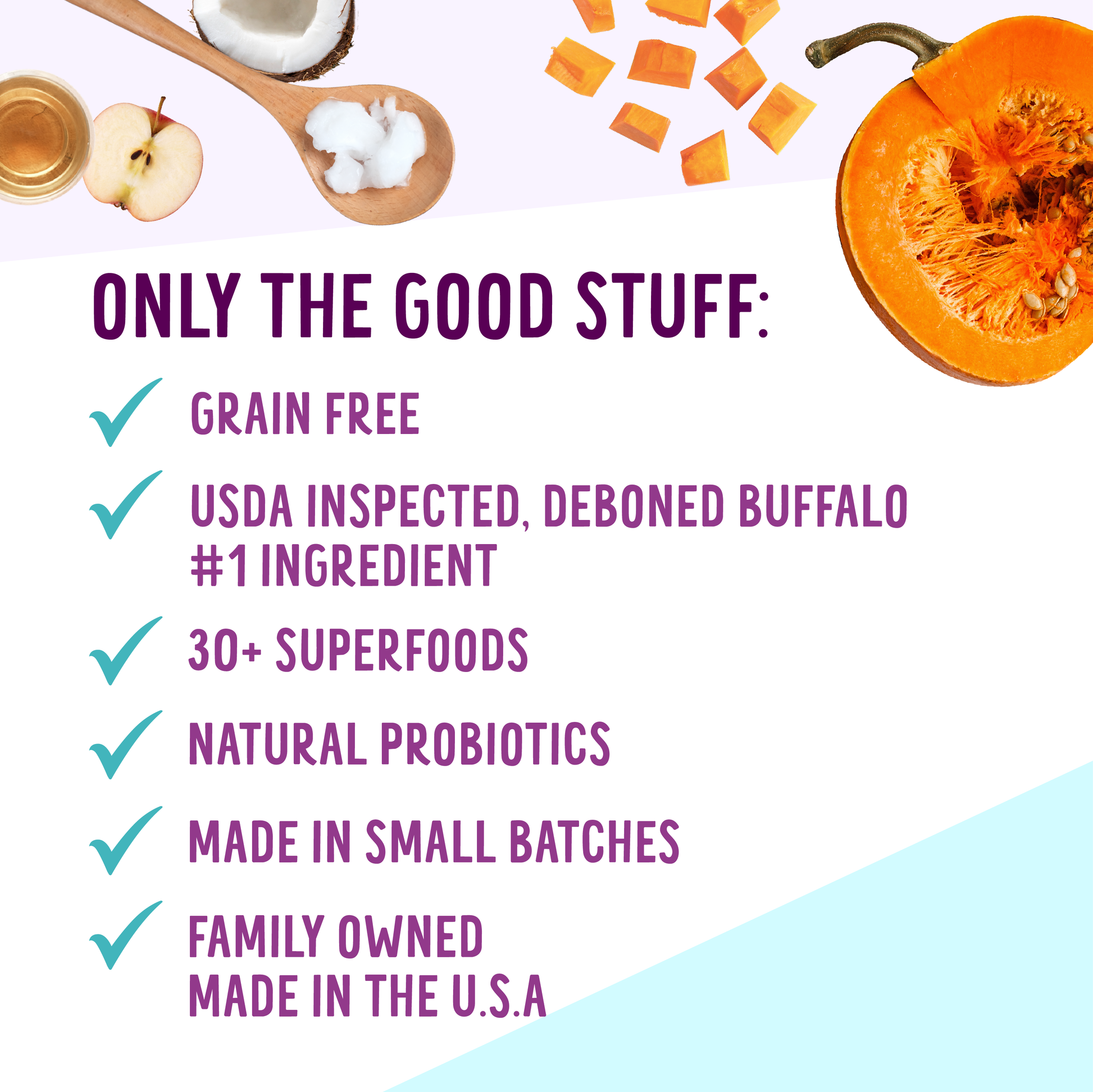 Buffalo, Deboned Whitefish, Buffalo Meal, Whitefish Meal (source of Omega 3 fatty acids), Chickpeas, Lentils, Salmon Oil (preserved with Mixed Tocopherols), Tapioca Starch, Whole Sweet Potatoes, Pumpkin, Peas, Coconut Oil (preserved with Mixed Tocopherols), Whole Carrots, Dried Seaweed Meal, Pomegranate, Blackberries, Whole Blueberries, Whole Cranberries, Raspberries, Potassium Chloride, Spinach, Turmeric, Tomato, Beets, Parsley, Chicory Root Extract, Sage, Bovine Colostrum, Organic Apple Cider Vinegar, Ginger, Green Tea Extract, Vitamin A Acetate, Vitamin E Supplement, Riboflavin Supplement, Vitamin B12 Supplement, Vitamin D3 Supplement, Niacin Supplement, Choline Chloride, Pyridoxine Hydrochloride, Thiamine Mononitrate, Folic Acid, Biotin, Inositol, Organic Dehydrated Kelp, Zinc Polysaccharide Complex, Iron Polysaccharide Complex, Manganese Polysaccharide Complex, Copper Polysaccharide Complex, Cobalt Polysaccharide Complex, Calcium Iodate, Sodium Selenite, Yucca Schidigera Extract, Pectin, Dried Lactobacillus acidophilus Fermentation Product, Dried Lactobacillus casei Fermentation Product, Dried Enterococcus faecium Fermentation Product, Dried Bacillus subtilis Fermentation Product, Dried Bacillus licheniformis Fermentation Product, Dried Baciollus coagulans Fermentation Product, Dried Aspergillus oryzae Fermentation Product, Dried Aspergillus niger Fermentation Product.