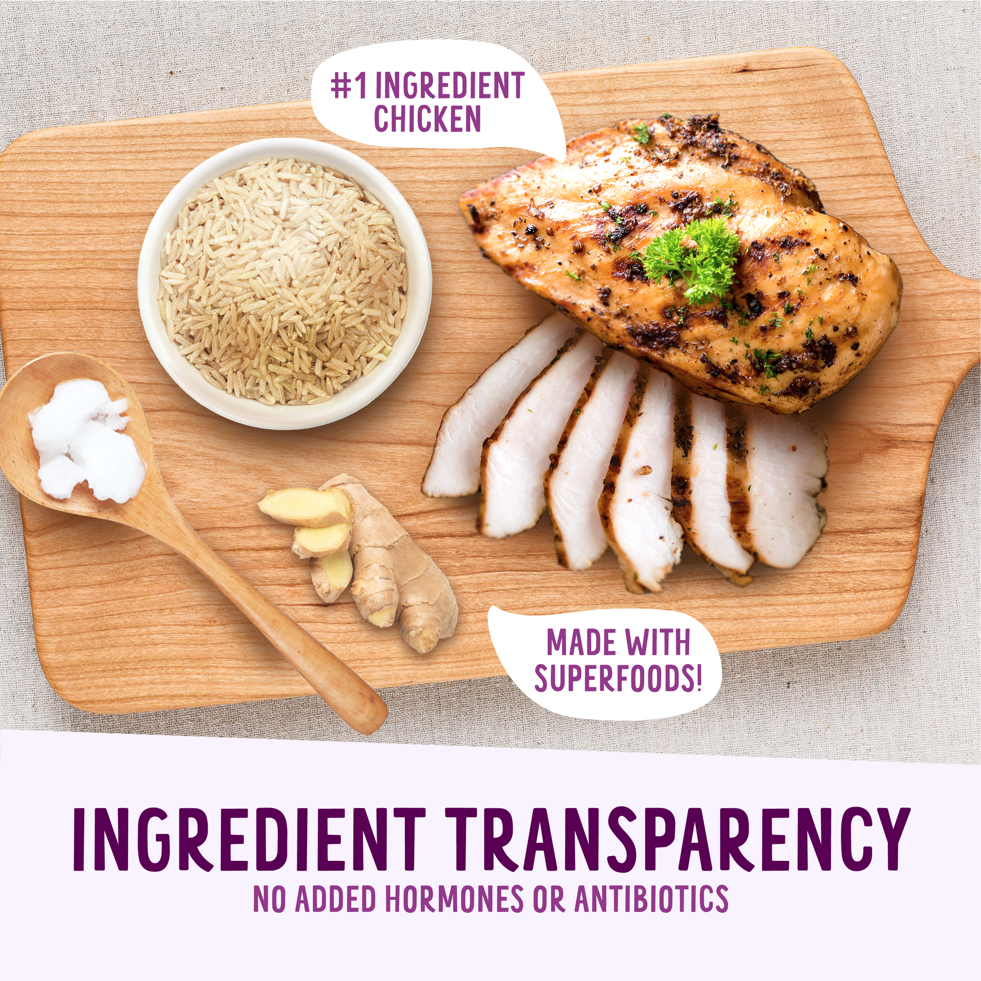 Organic Deboned Chicken, Chicken Meal, Ground Brown Rice, Oatmeal, Chicken Fat (preserved with Mixed Tocopherols), Lamb Meal, Menhaden Fish Meal, Flaxseed, Coconut Oil, Dried Plain Beet Pulp, Brewers Dried Yeast, Egg Product, Turmeric, Bovine Colostrum, Organic Apple Cider Vinegar, Ginger, Green Tea Extract, DL-Methionine, Vitamin A Acetate, Vitamin E Supplement, Riboflavin Supplement, Vitamin B12 Supplement, Vitamin D3 Supplement, Niacin Supplement, Choline Chloride, Pyridoxine Hydrochloride, Thiamine Mononitrate, Folic Acid, Biotin, Inositol, Dehydrated Kelp, Zinc Polysaccharide Complex, Iron Polysaccharide Complex, Manganese Polysaccharide Complex, Copper Polysaccharide Complex, Cobalt Polysaccharide Complex, Calcium lodate, Sodium Selenite, Yucca Schidigera Extract, Dried Lactobacillus acidophilus Fermentation Product, Dried Lactobacillus casei Fermentation Product, Dried Enterococcus faecium Fermentation Product, Dried Bacillus subtilis Fermentation Product, Dried Bacillus licheniformis Fermentation Product, Dried Bacillus coagulans Fermentation Product, Dried Aspergillus oryzae Fermentation Product, Dried Aspergillus niger Fermentation Product.