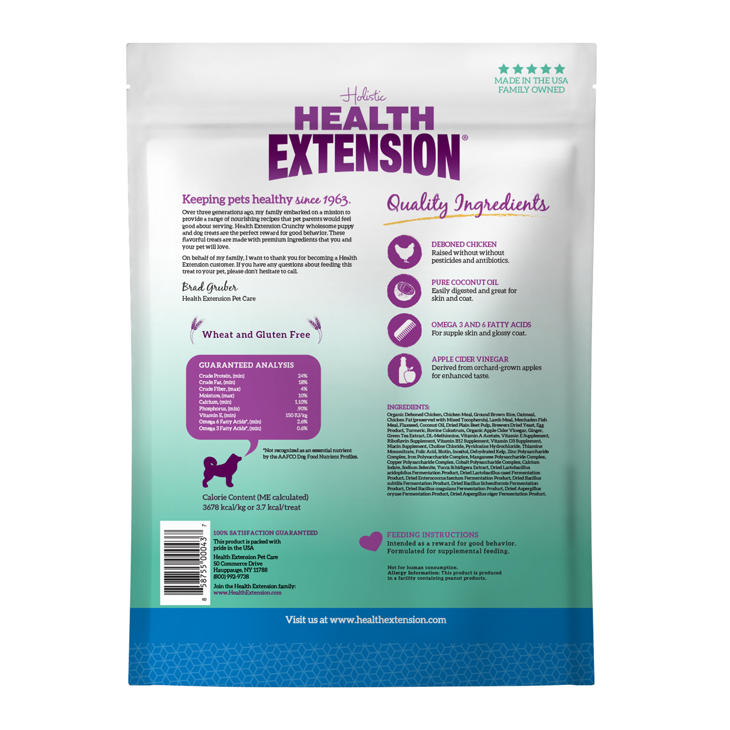 Show your dog the same love they give you every day with our exceptionally healthy and delightful treat! We've transformed our popular Original Chicken & Brown Rice Recipe dog food into charming, heart-shaped, bite-sized treats. Made with select cuts of organically raised chicken and highly digestible brown rice, this protein-first recipe is packed with nutrition. We've also infused these treats with advanced ingredients like anti-inflammatory turmeric, wholesome apple cider vinegar, and revitalizing ginger, along with natural probiotics to support proper digestion. When you treat your dog or puppy with Health Extension Heart Shaped Treats, you're not just giving them a tasty snack – you're providing them with complete and balanced nutrition in every loving bite.