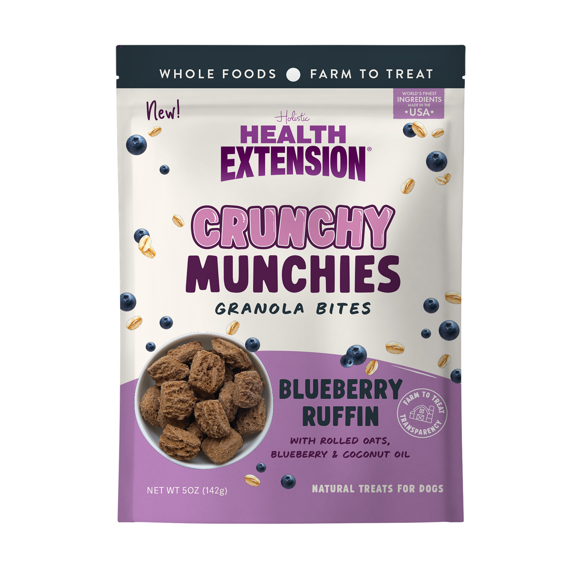 Treat your furry companion to the irresistible taste of Blueberry Ruffin Granola Bites! Inspired by the flavors of a freshly baked blueberry muffin, these crunchy treats are crafted with premium, human-grade ingredients, including rolled oats, juicy blueberries, and nourishing coconut oil. A dash of cinnamon and a hint of vanilla complete the flavor profile, making these bites as nutritious as they are delicious. Designed with your dog’s happiness and health in mind, these granola bites provide a wholesome snack that's perfect for training or rewarding good behavior. With no artificial additives and sourced from natural, USA-based ingredients, you can feel confident giving your pup a treat they'll love.