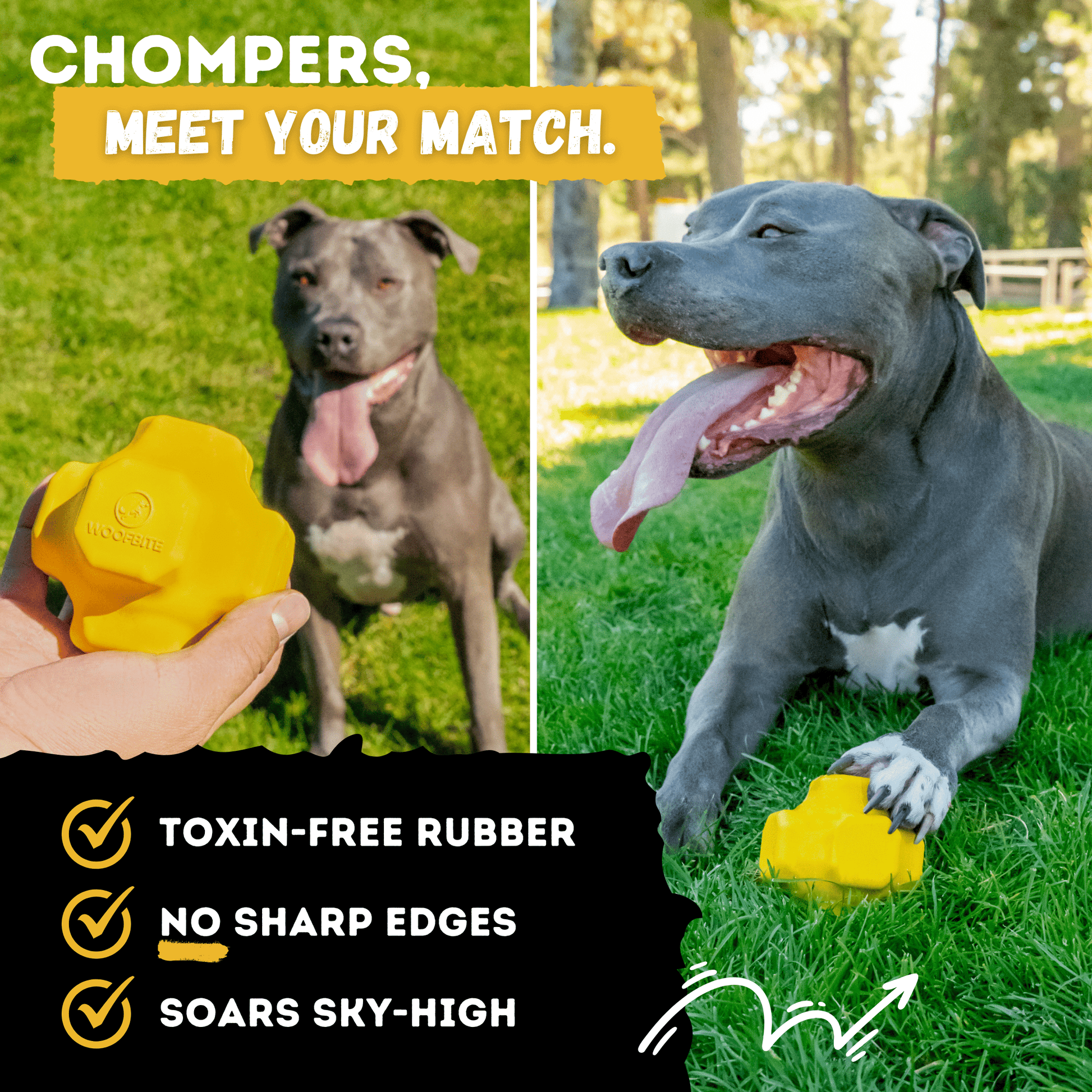 • Loved by Big Dogs - YELLOW (HIGHLY VISIBLE COLOR FOR DOGS) - The unique, engaging natural rubber & bright yellow color make WOOFBITE toys irresistible to dogs, ensuring they are obsessed from the moment you unbox it.