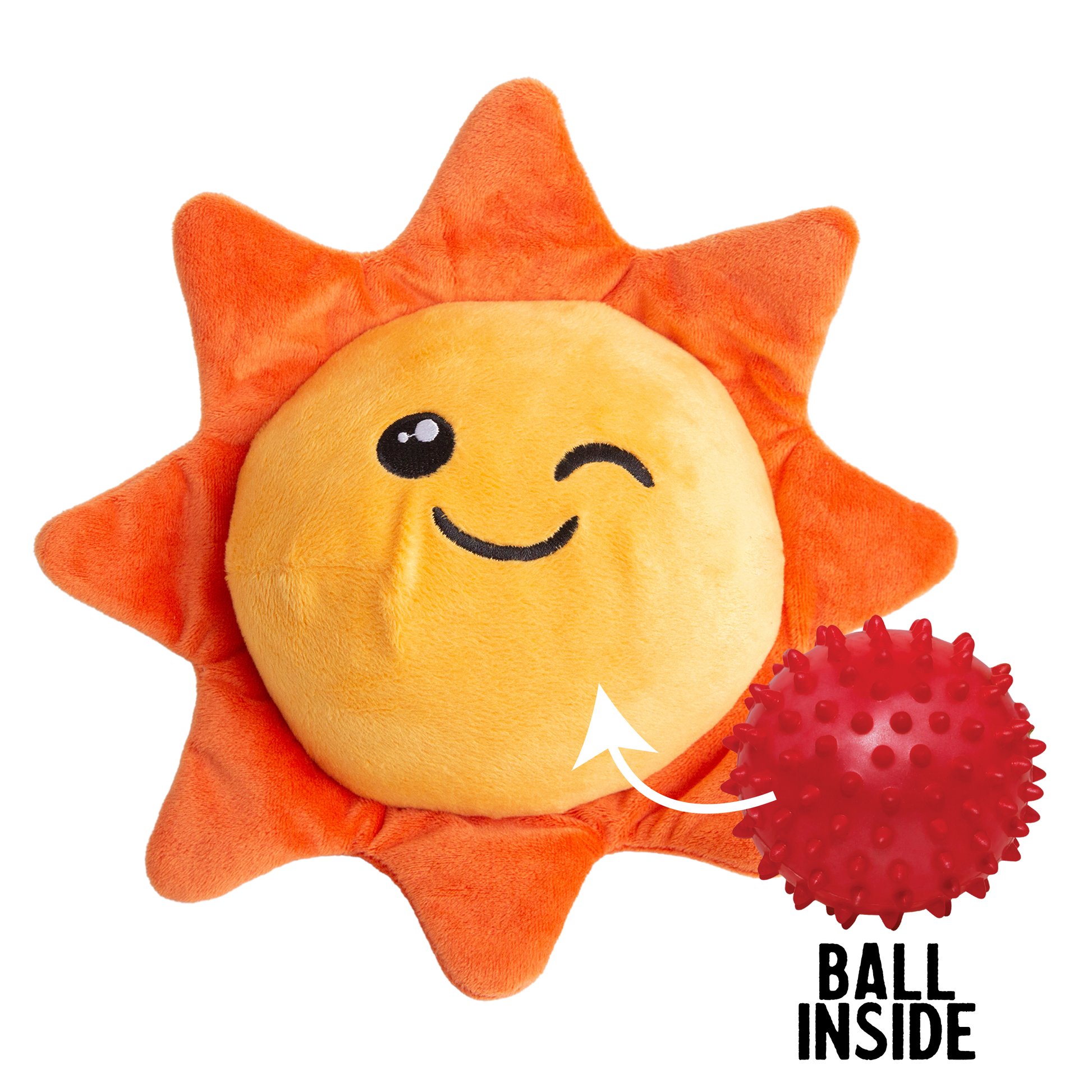 Treat your pup to the perfect companion for a sunny day - Sweet Sunshine (2 in 1 Toy)! This adorable plush yellow squeaker toy features an irresistible winking eye surrounded by fun orange flames and will bring all the joy of summer fun wherever it goes. Toy is made from recycled water bottles and contains eco-friendly squeaker and crinkle material for hours of crinkly, squeaky fun! Toy is 8” in size.
