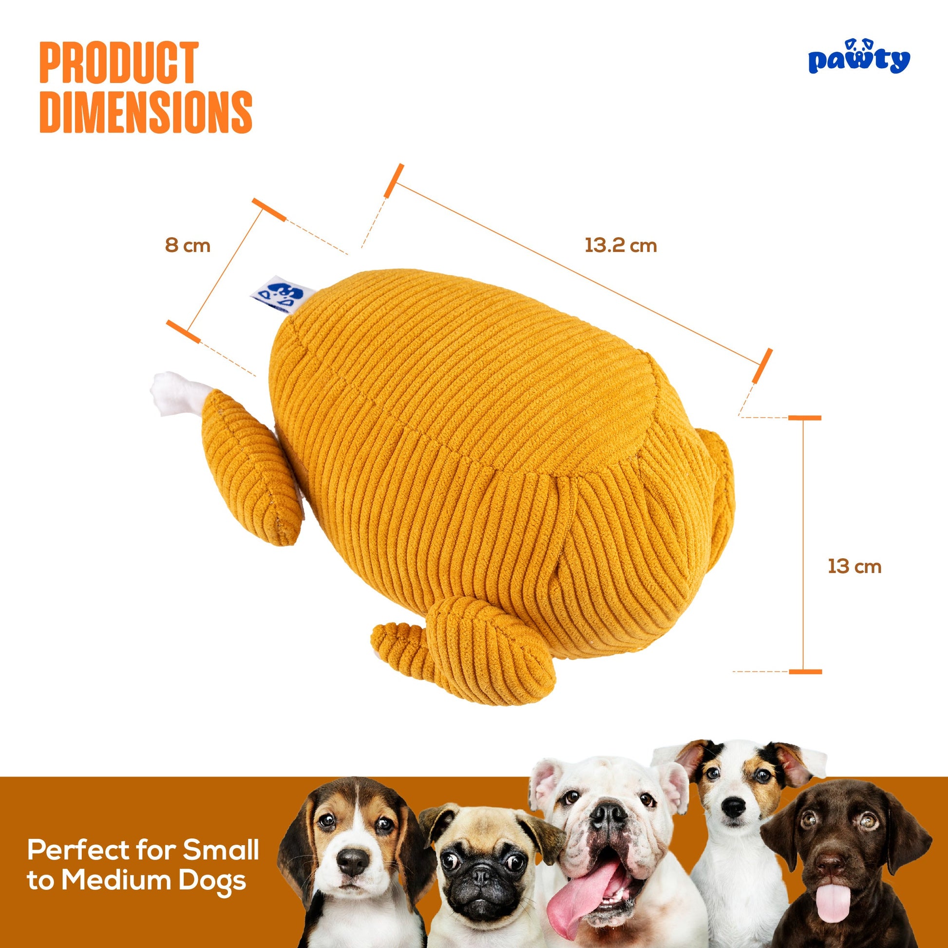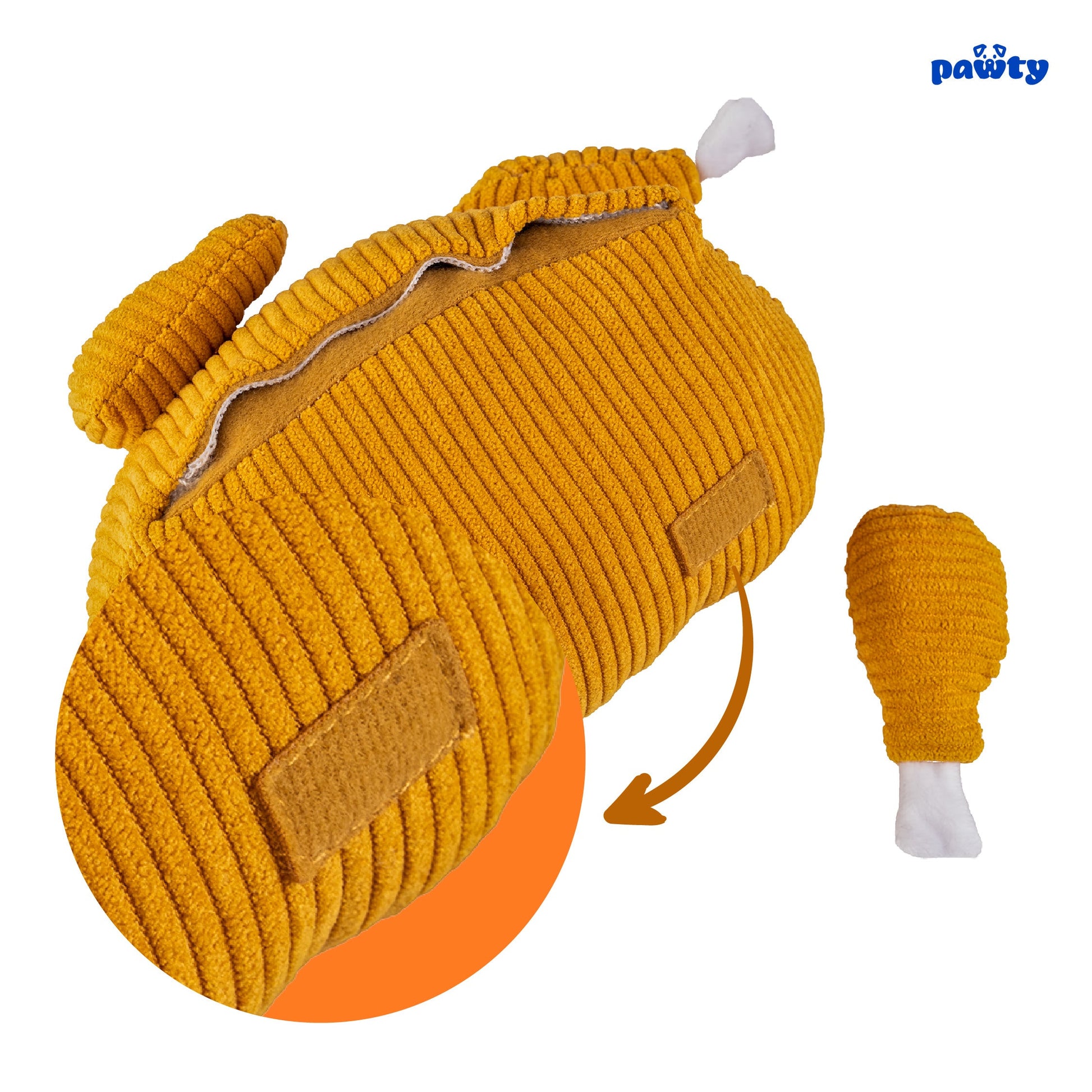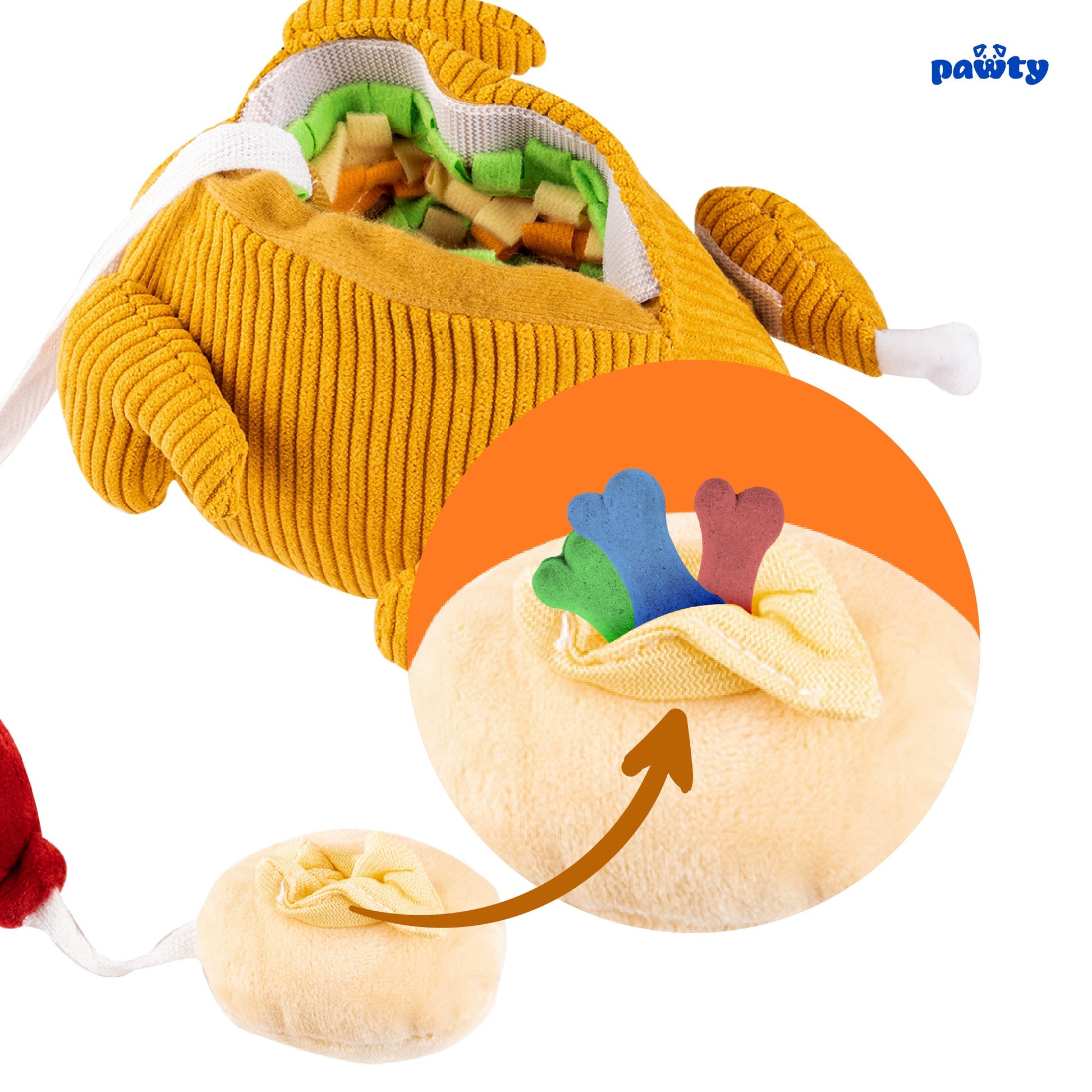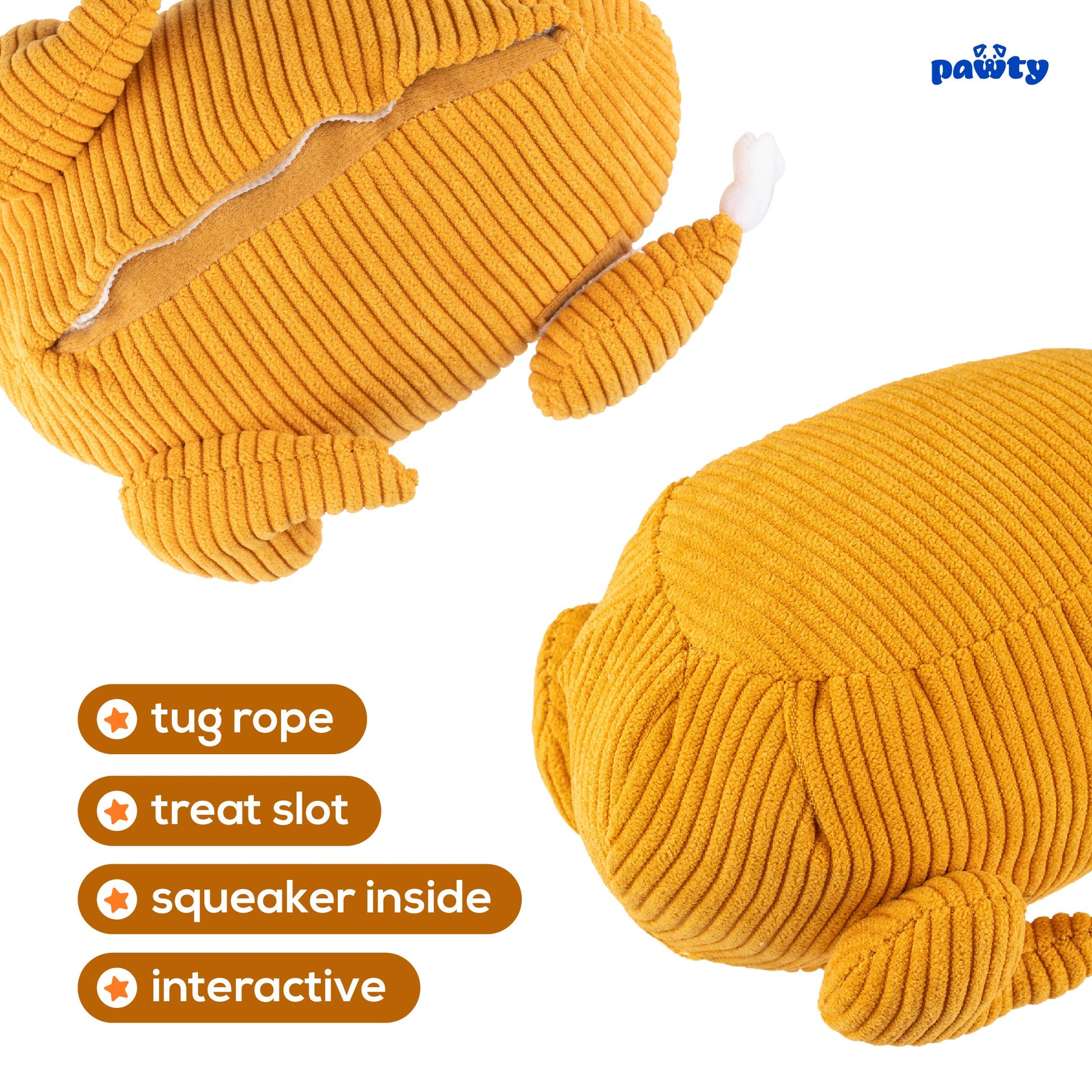 Celebrate every holiday or birthday with the Pawty Toys Turkey! Designed with cute detachable thighs, plushies inside, and a treat slot pull-out feature, this interactive toy is perfect for small to medium dogs looking for a fun chew and mental workout. This turkey is a sure hit for any occasion, made to bring laughs and excitement.
