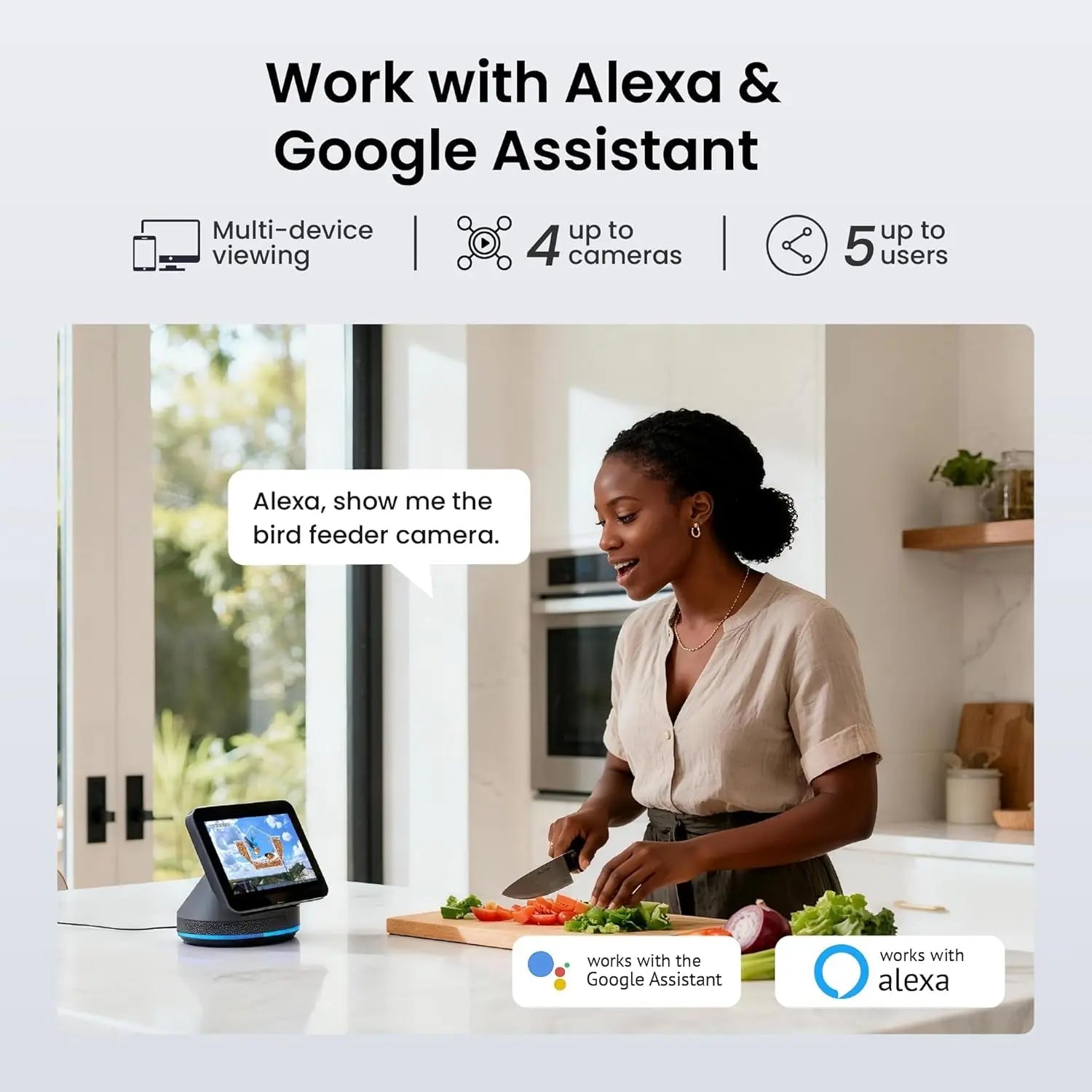 • Continuous 24/7 Recording: Store footage locally on a MicroSD card (up to 128 GB) or upgrade to secure, encrypted U.S.-based cloud storage.