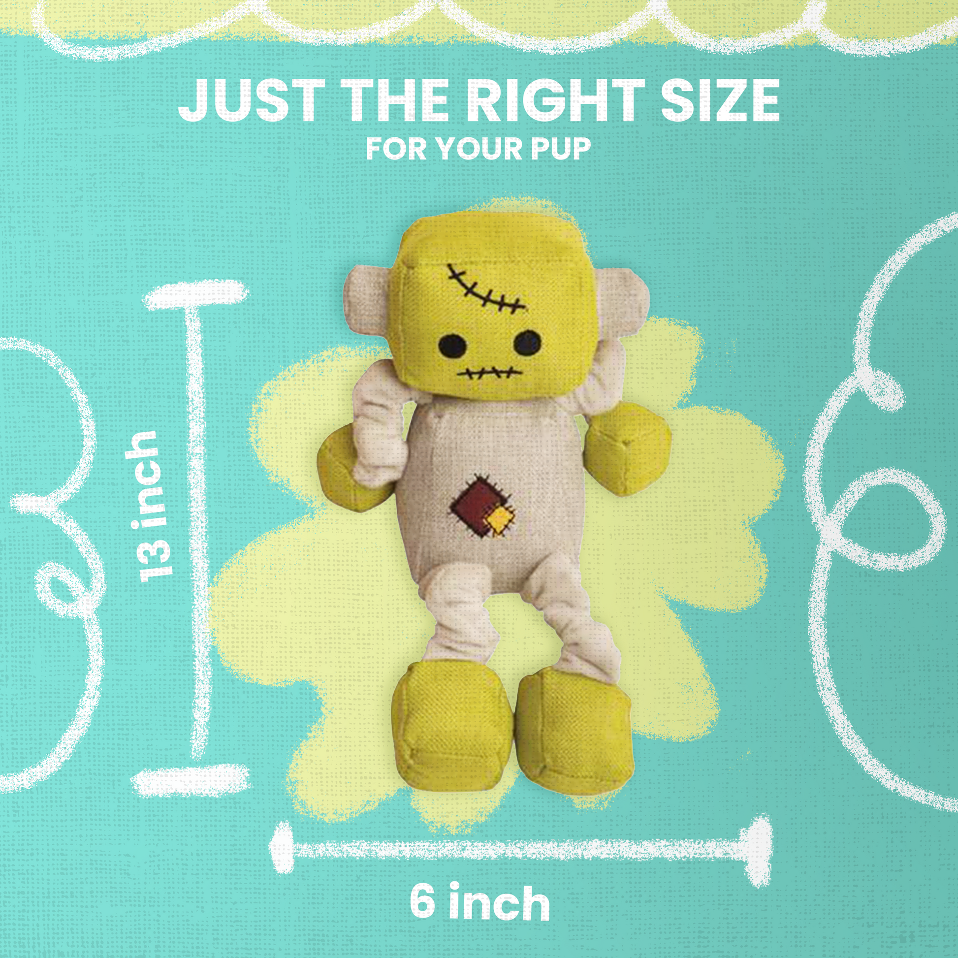 The Frank-N-Bot plush toy is the epitome of adorableness and amusement, enhanced with a playful squeaker for added joy! It seamlessly joins our festive collection alongside the Jack-O-Bot and Skel-O-Bot as an essential addition to your dog's Halloween toy lineup. Crafted with a robust linen exterior, Frank-N-Bot boasts crinkly fillings and whimsically stretchy bungee limbs for a unique blend of textures and playability. Safe, non-toxic, and sized at 13 inches, it's the ideal playmate for medium-sized dogs. Each Frank-N-Bot toy offers a delightful combination of squeaks and crinkles, enriching your dog's playtime with a symphony of sounds and a variety of tactile experiences.