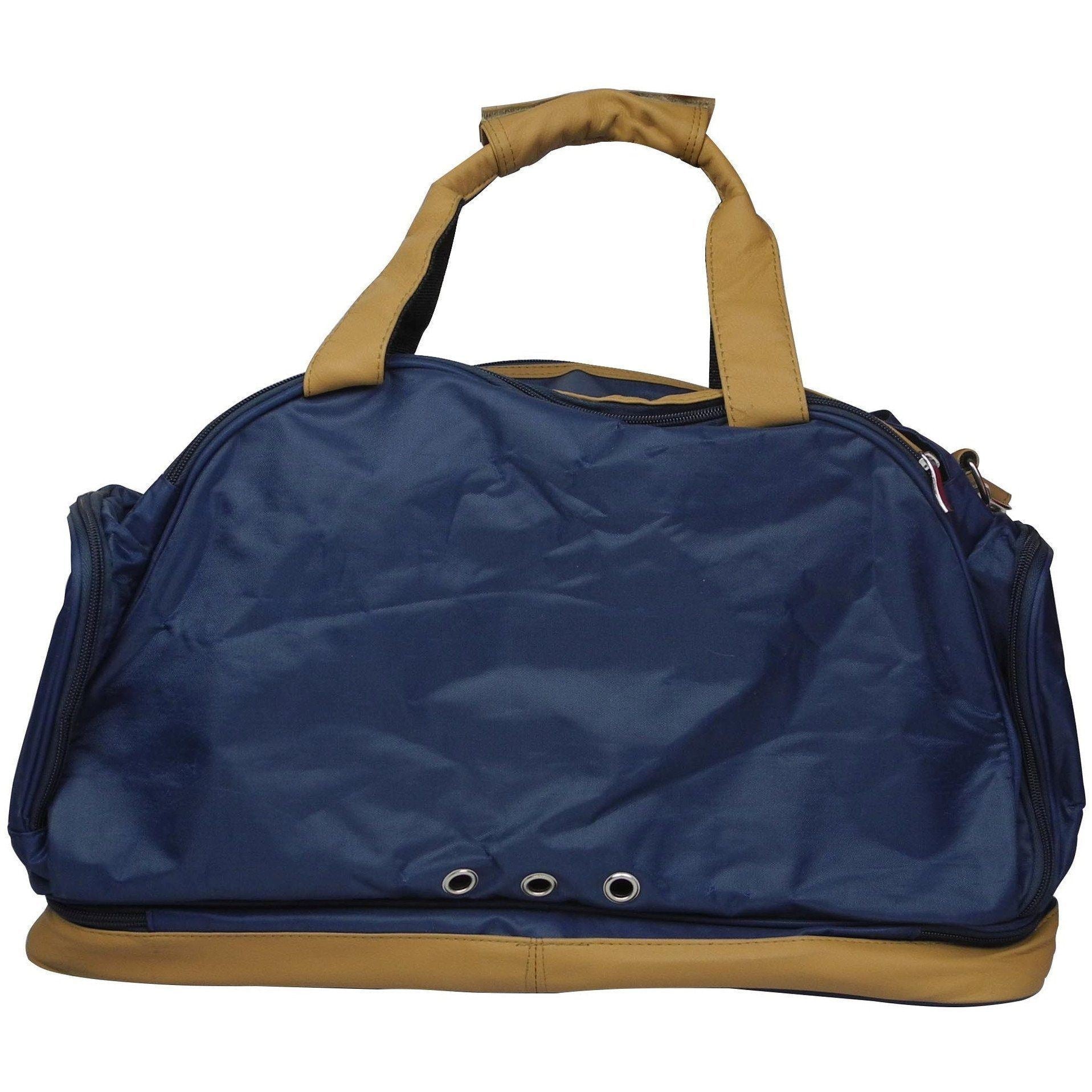 The Multi-Storage Compartment Fashion Pet Carrier Tote is composed of thick Polyester with accented Suede with Tough Mesh netting for sunlight and breathability. This Pet Carrier features a unique hidden 3 inches bottom compartment that zips 360 Degrees and is great for added storage. In addition to the bottom storage this Dog Carrier features 2 side zippered pouches and 4 front and back zippered compartmental pockets for further storage totaling 7 compartments. Comes with an Over-The-Shoulder strap and features a built-in leash holder inside.