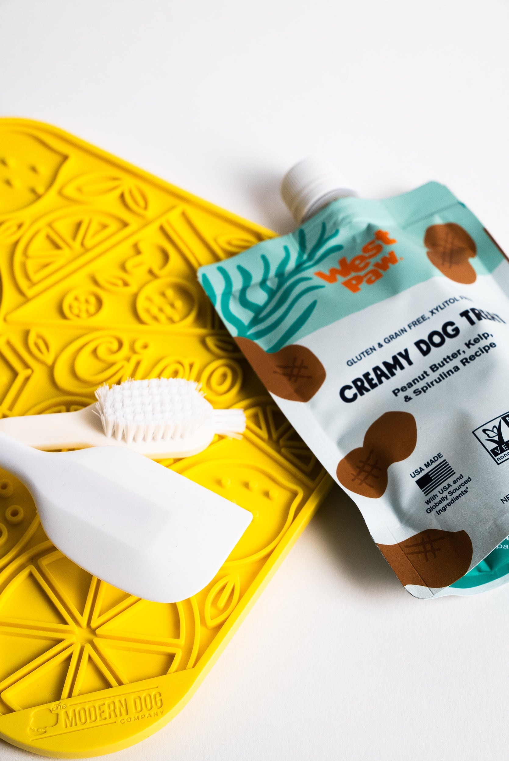 Includes: 1 lick mat & 1 spatula & 1 Scrub Brush (west paw peanut butter not included)